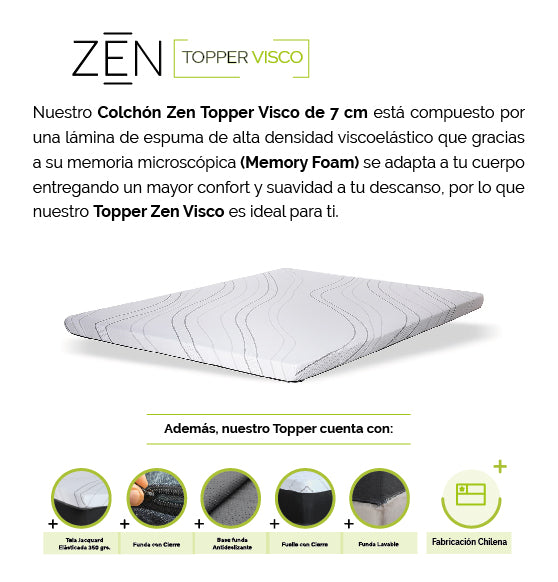 El colchón Zen Topper Visco King ofrece un descanso superior gracias a su lámina de espuma viscoelástica de alta densidad. Su tecnología Memory Foam se adapta a la forma de tu cuerpo, proporcionando mayor confort y suavidad para un sueño reparador.