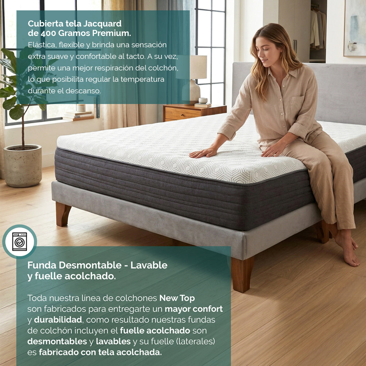 Ademas nuestro colchón tiene una cubierta de tela Jacquard de 400 Gramos, elástica y flexible brindando una sensación extra suave y confortable al tacto.