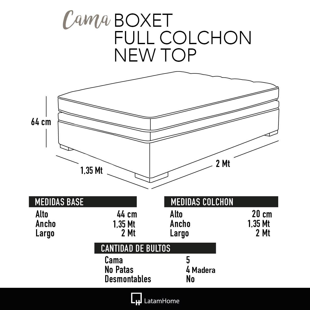 Cama Funcional Boxet full Colchon Resortes New Top con Funda Lavable.